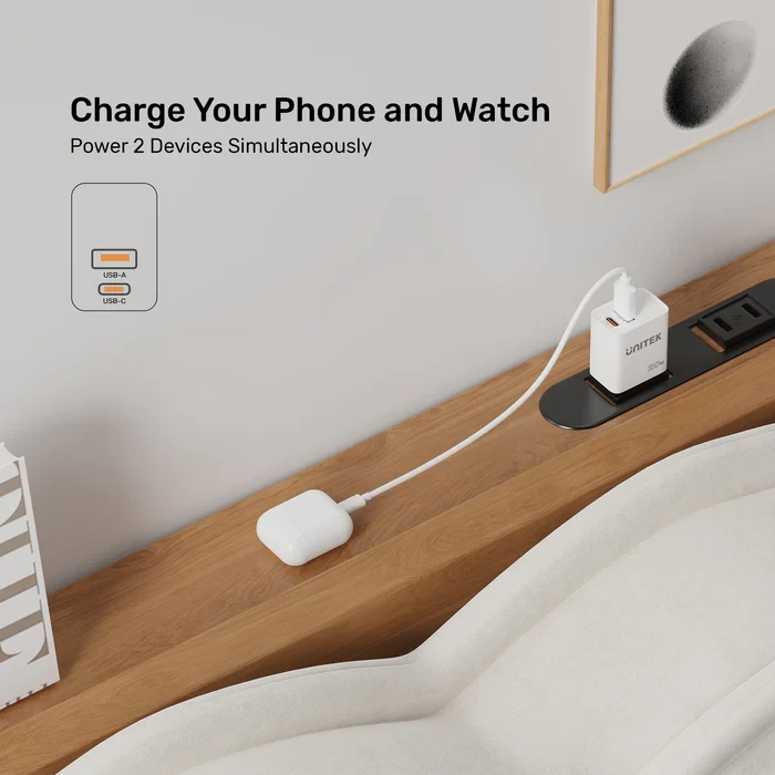 UNITEK מטען קיר 20W דו-יציאות (USB-C PD + USB-A QC) – קומפקטי צבע לבן