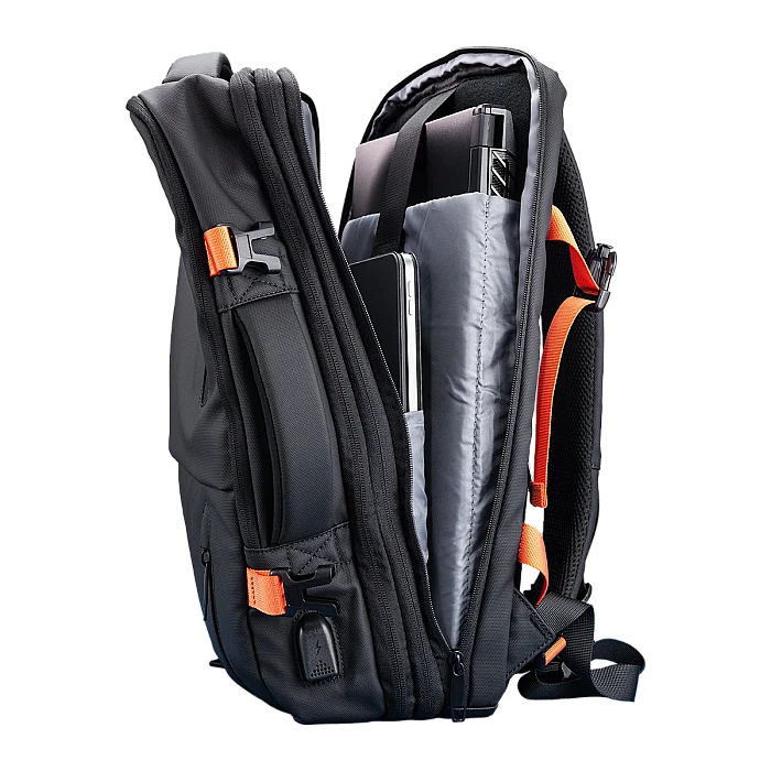 Vanguard מציע מצבי נשיאה שונים – Mode Select – לתרחישים שונים: נשיאה ביד למראה מקצועי, על הכתף או על הגב ליום-יום, וחיבור לידית מזוודה לנוחות מרבית בנסיעות. תאי אחסון קדמיים, תא בגדים נפרד, תאים נסתרים למניעת גניבה ותא ייעודי למחשב נייד שומרי על הסדר והביטחון. יציאת USB-A חיצונית מאפשרת לחבר סוללת גיבוי בתוך התיק ולהטעין את המכשירים בזמן תנועה, תוך שמירה על מראה נקי ומסודר.