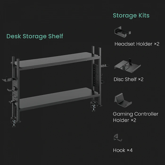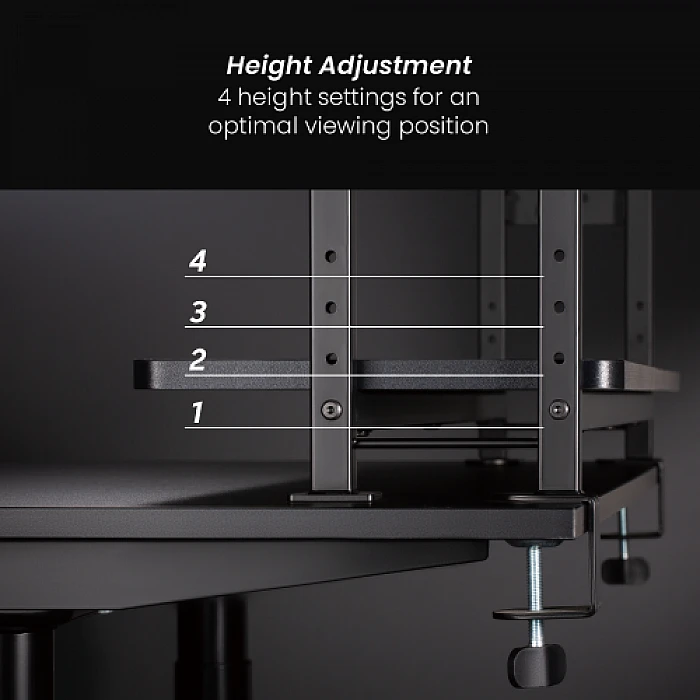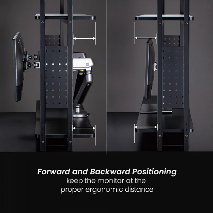 כמו אוזניות, מקלדות, דיסקים ועוד – בלי להעמיס על משטח העבודה. המדפים ניתנים למיקום קדמי או אחורי כדי לשמור על המסך במרחק ארגונומי,
