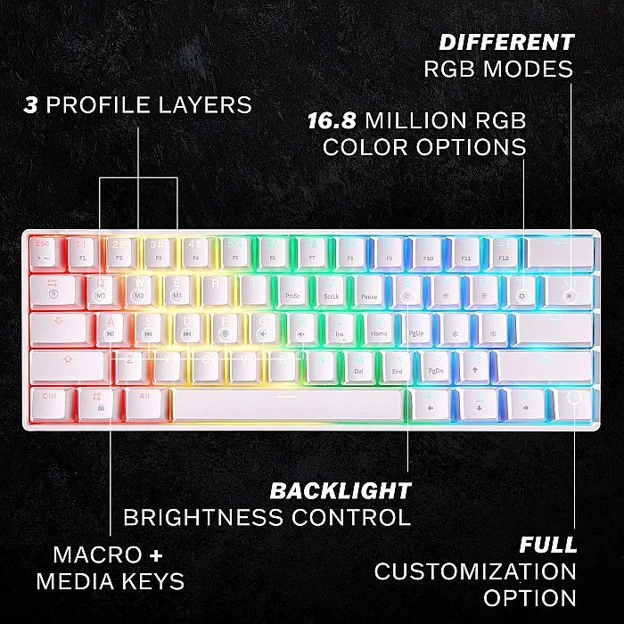 - עיצוב קומפקטי 60% – מקלדת קטנה ונוחה שמספקת יותר מקום על השולחן ומאפשרת נוחות בשימוש ממושך.