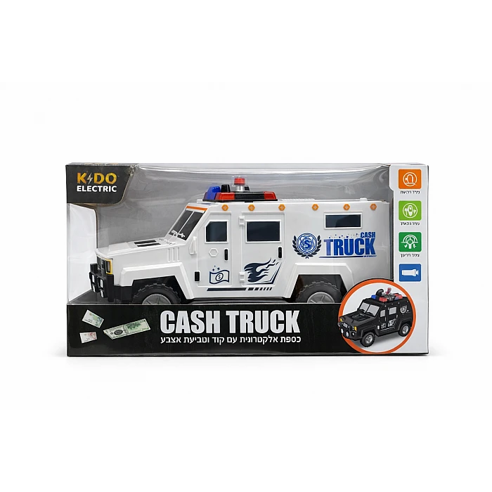 כספת חיסכון אלקטרונית לילדים בעיצוב ג׳יפ משטרה לבן, עם פתיחה באמצעות קוד אישי וטביעת אצבע.