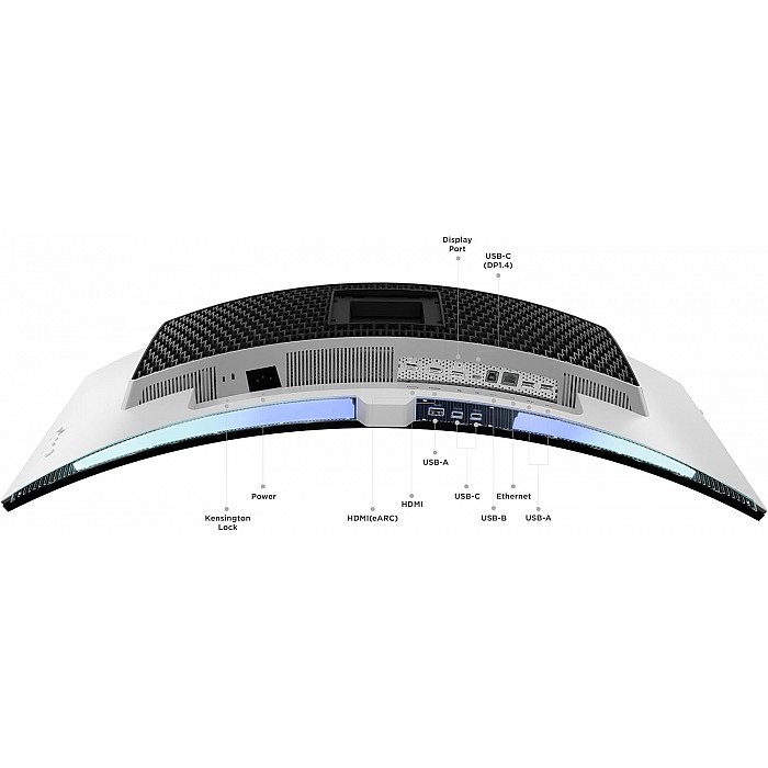 חיבוריות עשירה כולל HDMI® 2.1 FRL (אחד מהם עם eARC), DP 1.4 (HBR3), USB-C (DP 1.4 Alt Mode HBR3), רכזת USB 5Gbps (USB-B/USB-C upstream + USB-A/USB-C downstream), ורשת RJ-45 2.5G. תכונות חכמות: True Split (פיצול ייחודי לשתי כניסות בו־זמנית), KVM מובנה, PiP/PbP, חיישן בהירות סביבתי וחיישן זיהוי אנושי, Natural Low Blue Light (Eyesafe 2.0, TÜV). זוג רמקולים 5W×2, מתלה אוזניות ומעמד לטלפון משלימים עמדת גיימינג מושלמת.