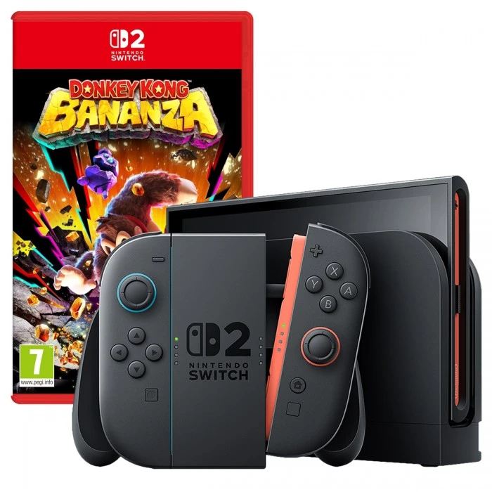 קונסולת Nintendo Switch 2 256GB בצבעי אדום/כחול ומשחק Donkey Kong™ Bananza, לצד אביזרי ערכה בהתאם למארז.
