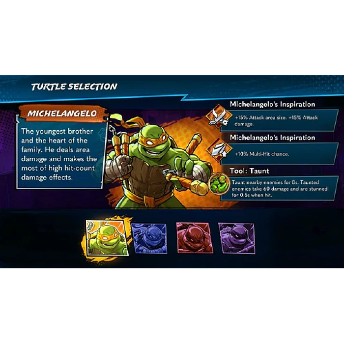 - שליטה בארבעת הצבים – לשלכל צב סגנון לחימה ויכולות ייחודיות שאפשר לשדרג.