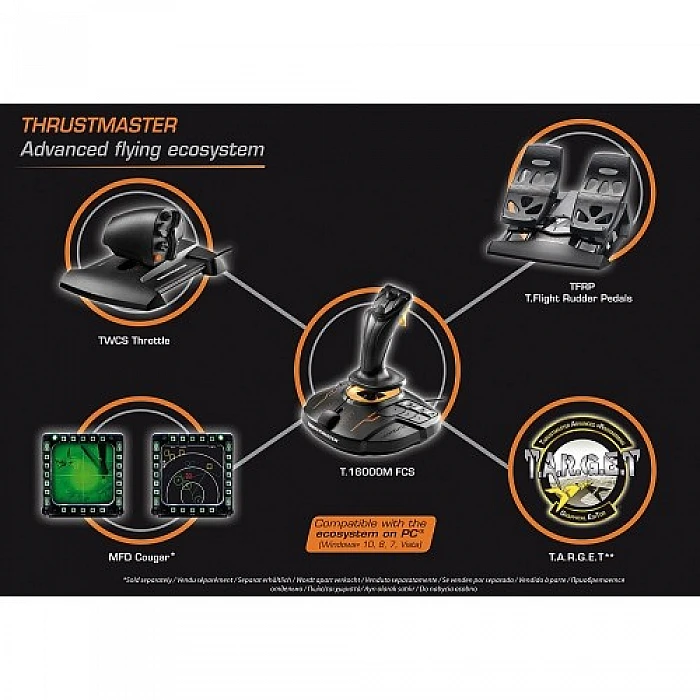 ה- T.16000M FCS כוללת 4 צירים עצמאיים, הגה מסתובב ומצערת מתקדמת, 16 כפתורי פעולה עם זיהוי כפתור פיזי בסגנון "ברייל" וטריגר ארגונומי