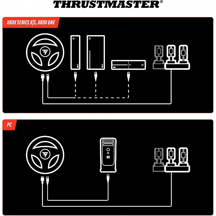 החיבור הוא Plug & Play – מחברים את ההגה לקונסולת Xbox או למחשב, והוא מזוהה באופן אוטומטי ברוב המשחקים הנתמכים, ללא צורך בהתקנה מורכבת. ב-PC ניתן לעדכן דרייברים דרך אתר Thrustmaster לקבלת תאימות מלאה.