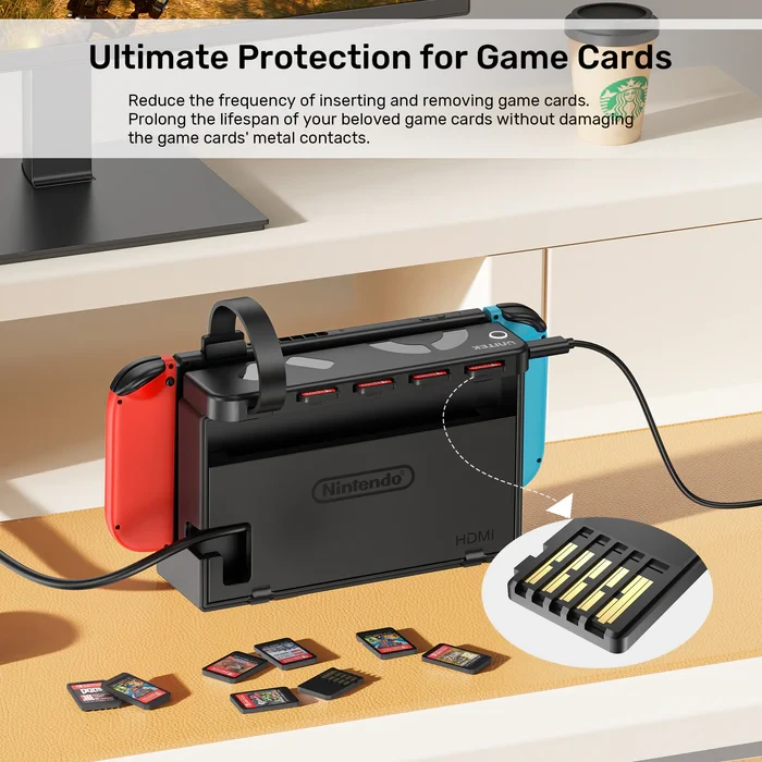 סדר, מהירות ונוחות בנגיעה אחת: קורא הכרטיסים של UNITEK מאפשר להכניס עד ארבעה כרטיסי משחק ולבצע מעבר מיידי בין משחקים באמצעות כפתור LED על המכשיר או שלט אלחוטי מצורף. מתחבר בבטחה לדוק של ה-Switch מבלי לחסום פתחי אוורור, ומקטין את השחיקה בחיבורי הכרטיסים.