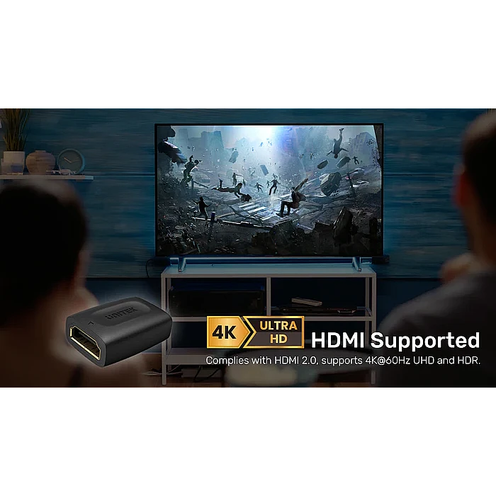 מצמד ה-HDMI 4K של UNITEK מאפשר לחבר שני כבלי HDMI להארכה נקייה ואמינה, עם תמיכה ב-4K@60Hz, HDR ותקן HDMI 2.0 – מתאים לטלוויזיות, קונסולות, מחשבים ומקרנים תואמים.