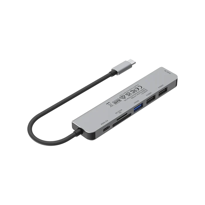 תחנת חיבור קומפקטית ממתכת אלומיניום: HDMI עד 4K@30Hz, USB-A במהירות 5Gbps + שני USB-A במהירות 480Mbps, קוראי SD ו-microSD, ויציאת USB-C PD 100W לטעינת מעבר המחשב בזמן עבודה. מתאימה ל-Windows, macOS, iPadOS ו-Android.